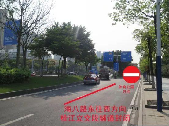 5、海八路东往西方向桂江立交路段辅道封闭,禁止车辆由海八路辅道进入体育公园。