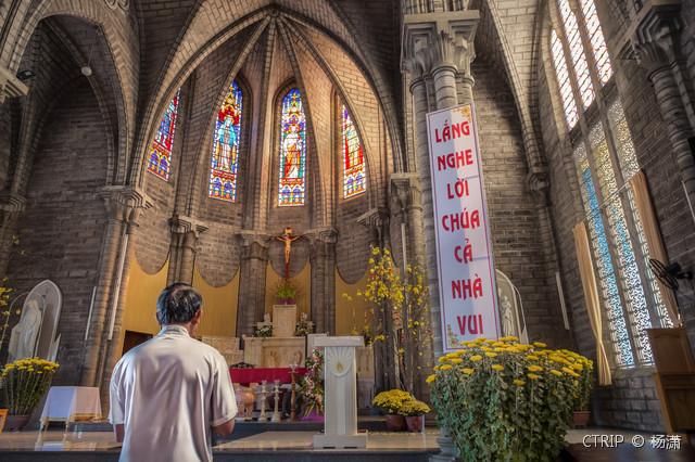 芽庄教堂是一座哥特式建筑,高大的钟楼气势恢宏,墙体的石刻和内部五彩雕花窗又不失别致。遇上晴天,屋外的阳光透过窗户,教堂宛然变成一座色彩斑斓的宫殿。