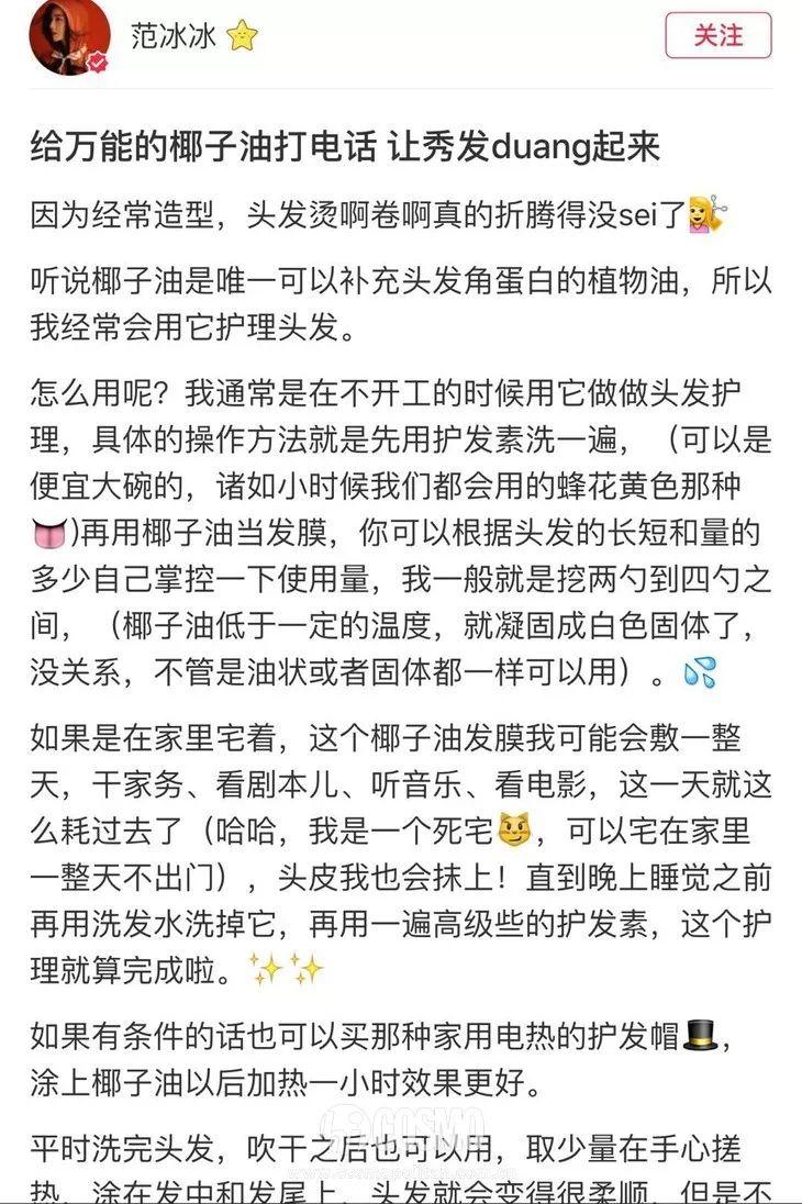 长期涂抹椰子油在头发上有利于头发的保湿,并避免枯燥毛糙,还可以促进头发健康生长。怪不得范冰冰这么爱椰子油!