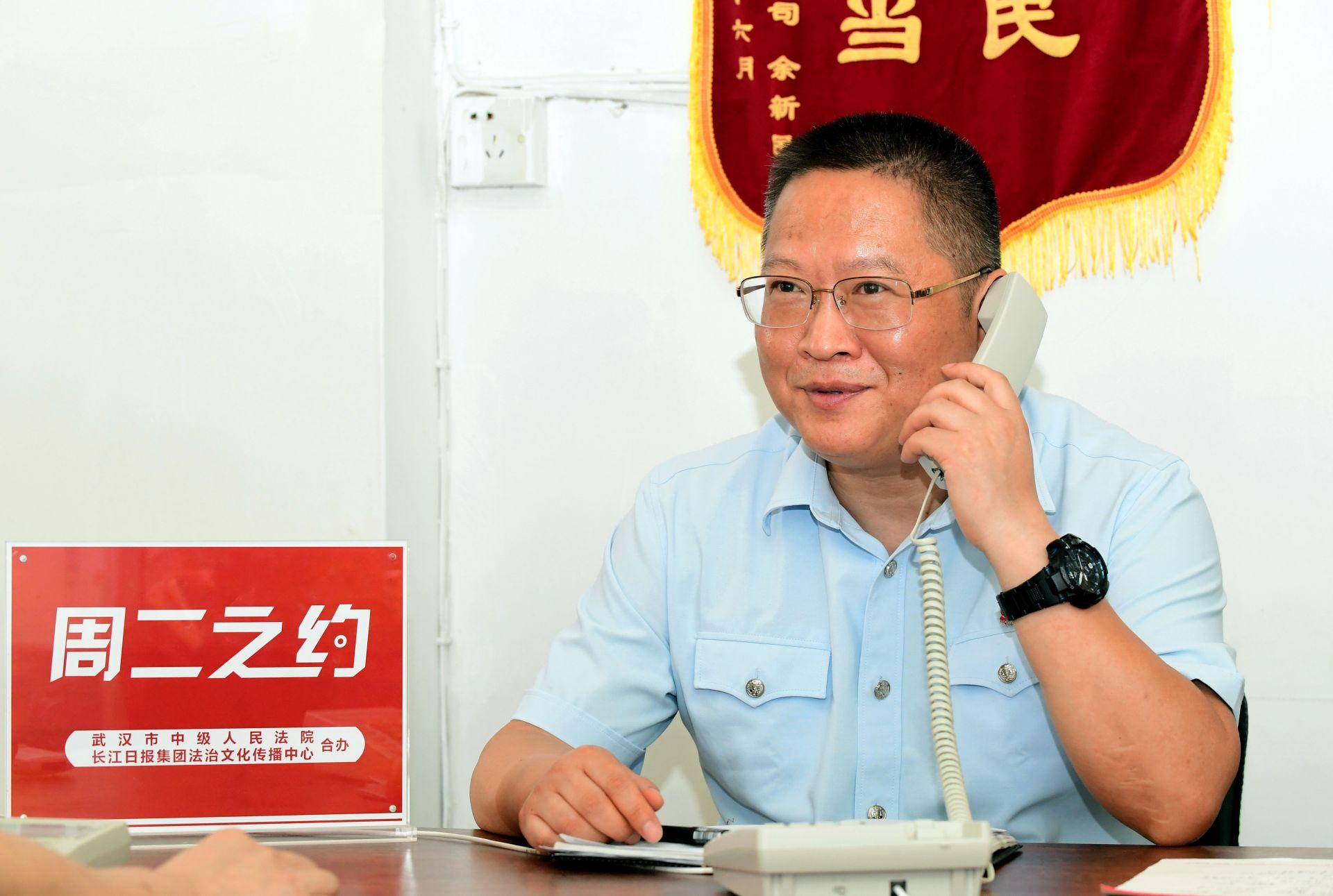 7月31日,武汉经济技术开发区法院副院长王锦中接听法律咨询热线。记者刘斌 摄