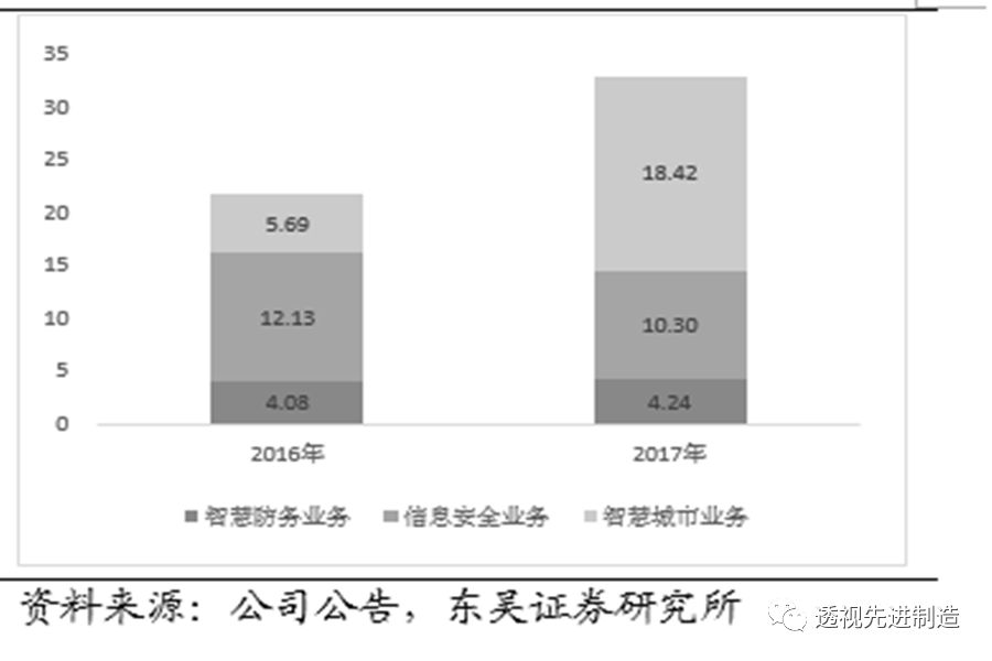 2017年公司实现营业收入32.97亿元,同比增长50.64%,实现归母净利润3.89亿元,同比增长3.18%。营业收入中智慧城市业务实现收入18.42亿元,同比增长224.02%;智慧防务业务实现收入4.24亿元,同比增长4.14%;信息安全业务实现收入10.30亿元,同比减少15.03%。智慧城市业务的大幅增长主要源自公司于2016年10月完成对北京泰豪智能工程有限公司的收购,业务整合顺利,2017 年比上年同期新增智慧城市顶层设计、实施和运营业务收入。