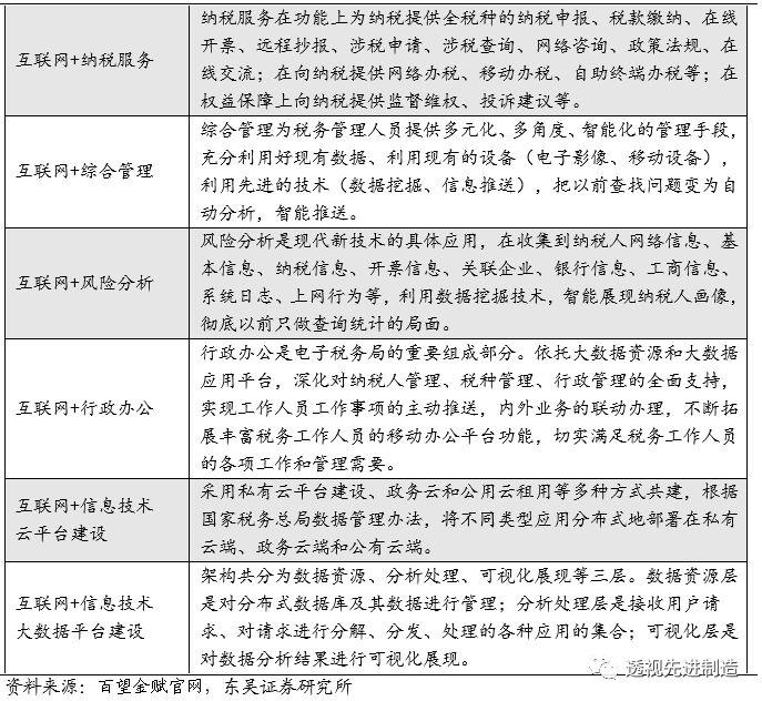 目前我国的税控产品有两大体系,航天科工体系和总参体系,前者中航天信息一家独大,后者中旋极信息为最主要的参与者,市场份额最大。目前旋极信息的税务信息化业务不仅包括税控盘销售及收取后续服务费,还布局了电子发票领域、闪电*票开**项目、拓展增值服务领域,开发智能POS专用多功能终端、基于大数据的税务自动稽查平台、基于税务大数据的企业税务自查平台产品。根据百望金赋官网,公司建设“互联网+智慧国税”现代税收管理新格局,从纳税服务、综合管理、风险分析等6个方面构建基于“互联网+”的新型征纳关系。