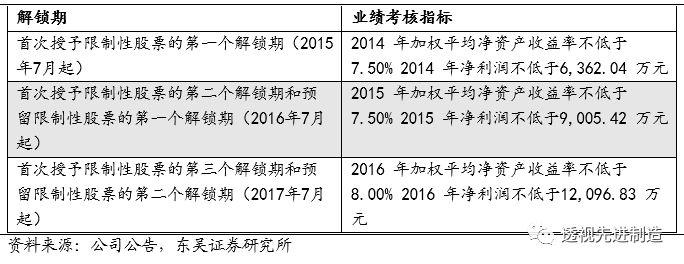 首次授予的限制性股票自授予日起 12个月后分3年解锁,解锁比例为30%、30%、40%,解锁条件为2014-2016年的加权平均净资产收益率不低于7.5%、7.5%、8%,净利润不低于6362万元、9005万元、12097万元。目前公司首次股权激励所授予的股票已到期解锁。