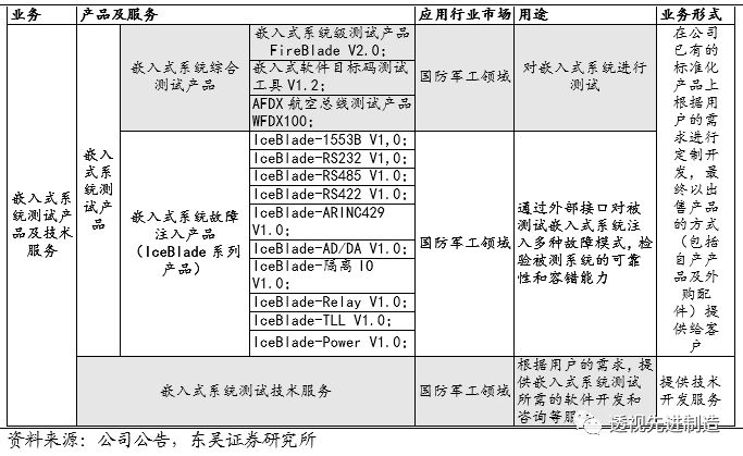 嵌入式系统测试业务方面,公司1997年成立之初的业务即为代理欧美嵌入式系统开发工具类产品,为国内大量的军工领域客户提供嵌入式软件和硬件开发工具,自1998年起,公司将先进的嵌入式系统测试技术和航电总线技术相结合,抓住国防军工领域测试系统国产化要求而产生的对嵌入式系统测试产品需求不断扩大的机遇,不断拓展在国防军工行业的市场份额。公司产品和服务包括嵌入式系统综合测试产品、嵌入式系故障注入产品、嵌入式系统测试技术服务等,客户主要为各军工集团下属单位。