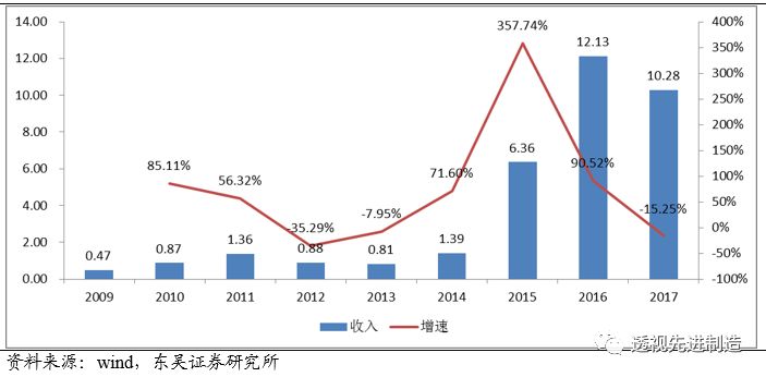 图表 11:2009-2017公司信息安全业务(主要为税务信息化业务) 收入和增速(亿元)