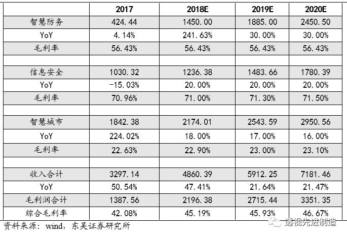 智慧城市方面,随着我国智慧城市建设推进,预计公司智慧城市业务将保持较快增长,随着大数据服务的增加毛利率也将逐渐提升,假设2018-2020年收入增速为18%、17%、16%,毛利率为22.9%、23%、23.10%。