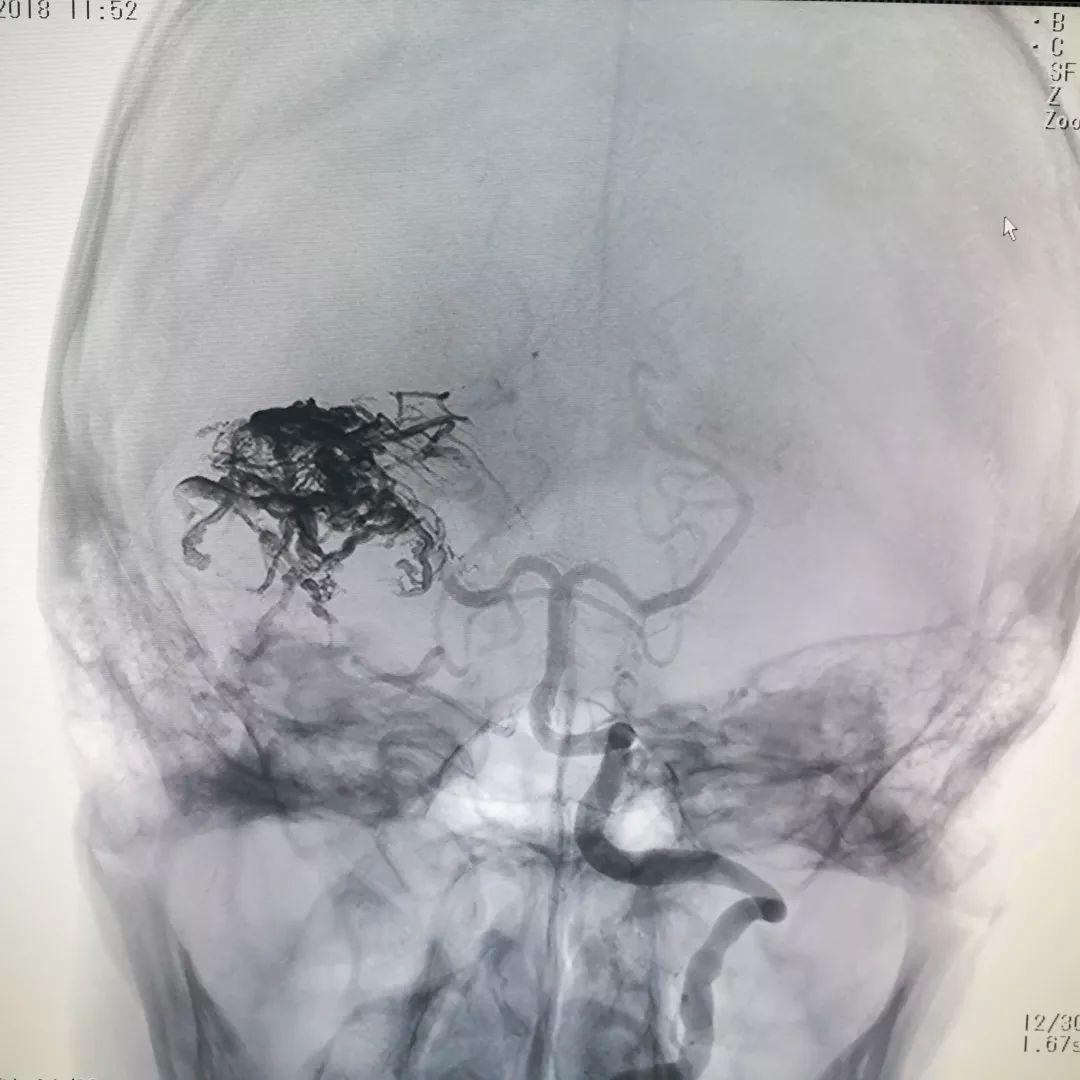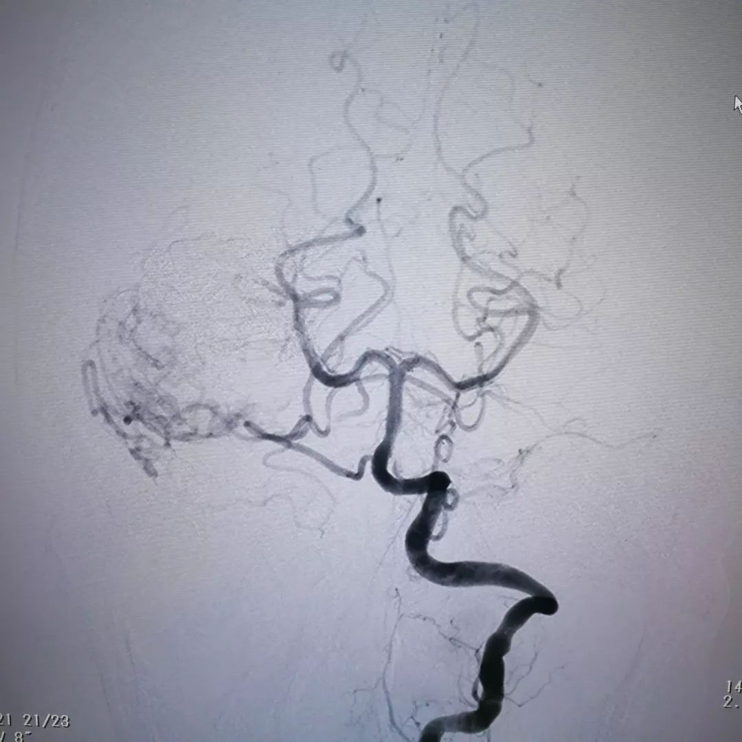 脑血管造影证实肿瘤血供极其丰富,血窦样结构充满血液,供血动脉粗大