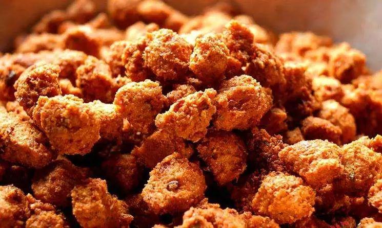 田家庵是淮南三镇之首,田家庵老街小吃既丰富又具有特色,馄饨、水饺、元宵、羊肉汤、牛肉汤、油酥烧饼、油茶和一品香炒货,应有尽有。说到小吃,最具特色的除淮南牛肉汤之外,当数红风戏院门口沈家的绿豆圆子。沈家的绿豆圆子炸得十分焦,特别脆,圆子是纯绿豆的,里面有黄豆芽、干子等,虾皮是必不可少的,因沈老板为人豪爽、热情,生意十分红火。只见沈老板麻利地抓起一把圆子,数也不数,往滚开的锅里一放,随即迅速盛到碗里,放上辣油、少许香醋,再撒上一些香菜做佐料,一碗香喷喷的绿豆圆子就好了。