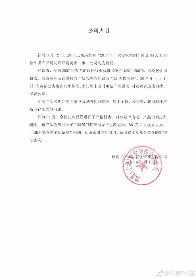3月13日,85度C在官网发布声明称,目前85度C全国门店已经进行了严格排查,对涉及肉松产品说明进行删除,新产品说明已经在工商部门监督指导下更改完毕。