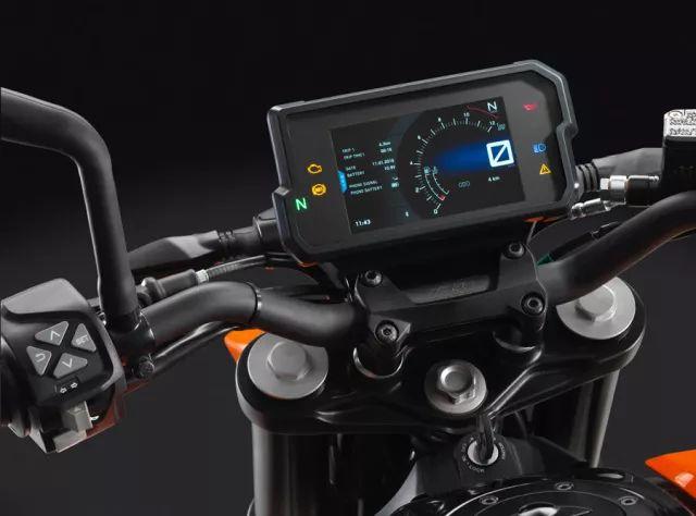 眼尖的车友们可能已经注意到,全新KTM 390 DUKE的仪表,已经升级为高颜值的TFT彩屏,并且可以随着环境的变化只能调整屏幕的亮度。别小看这块TFT彩屏,除了车辆状况展示、驾驶模式选择,搭配KTM MY RIDE模块(选配),可实现更多功能。
