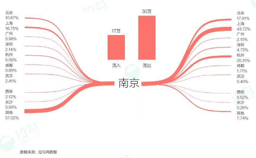纵观拉勾2017年全年的数据,虽然南京人才增速巨大,但人才流出大于其流入,从流出的方向来看,除了选择去北京和上海等一线城市外,杭州成为南京人才流出的首选城市,这一方面是因为两城较为接近,异地发展成本较低,另外杭州近年来互联网发展逐渐成熟,吸引大量人才“杭漂”。