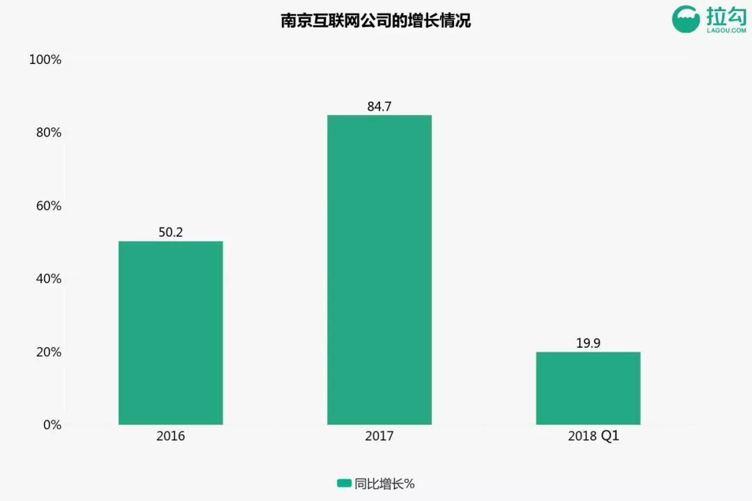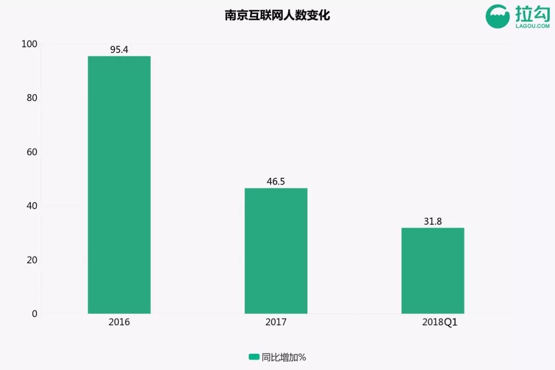 南京互联网从业者数量也逐年递增,2016年增幅高达95%,2018年第一季度增长超过三成。