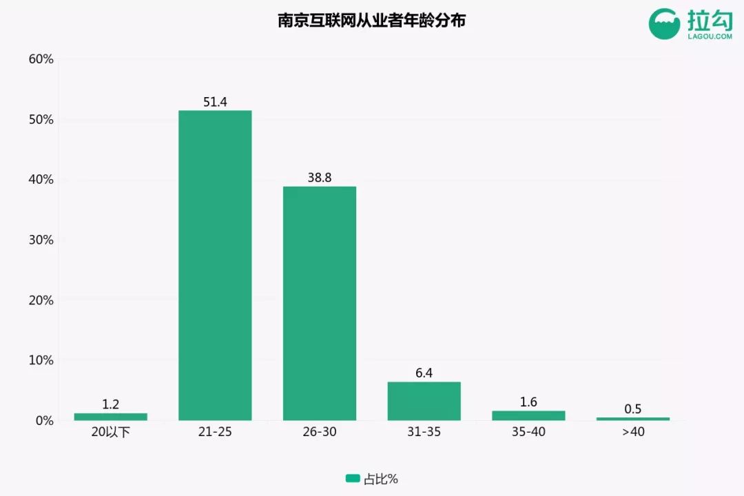 南京互联网人平均年龄在27岁,男性占比超过60%。其中,技术岗位的男性比例超过80%,而行政等岗位则女性居多。