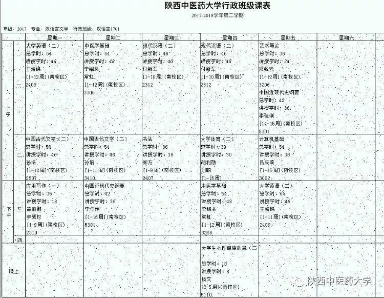 人文管理学院汉语言文学1701课表。