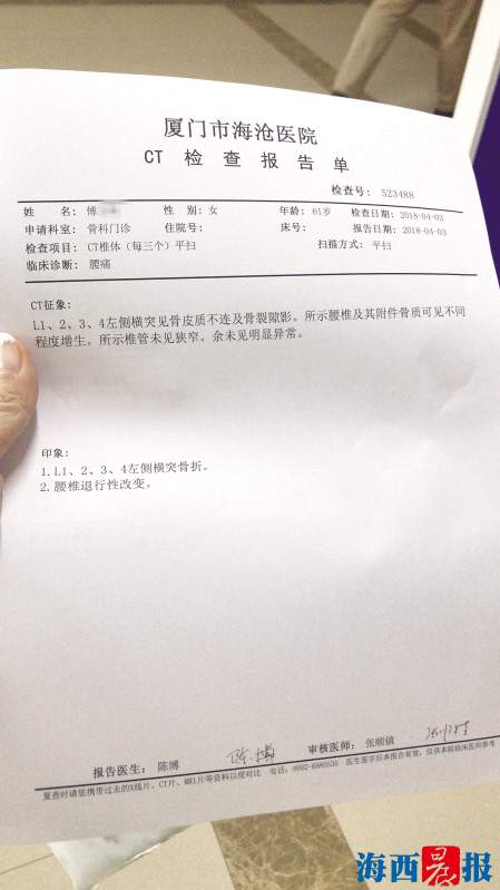 医院的CT检查结果让林女士一家人惊呆了———傅女士腰椎左侧L1、2、3、4横突骨折。
