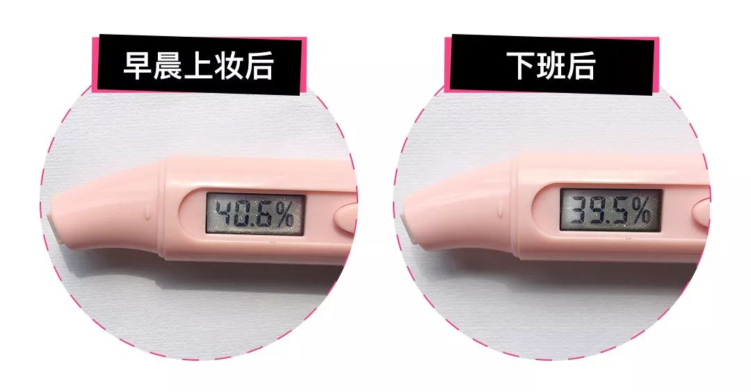 一直带妆到下午下班,没有出现令我担心的起皮和卡粉问题!而且气垫CC的贴合度真心好,有一种天生好皮肤的“伪素颜”妆效。现在用水分仪测试一下,比早晨刚上妆时略有下降,不过皮肤上是感觉不出来的。