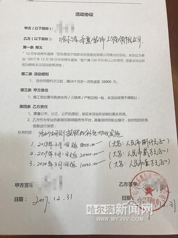 在李强出示的一份“活动协议”中记者看到,与“胖鸟装修”合作的施工公司承诺,“2018年3月1日返8000元、2019年3月1日返20000元、2020年3月1日返10000元。”