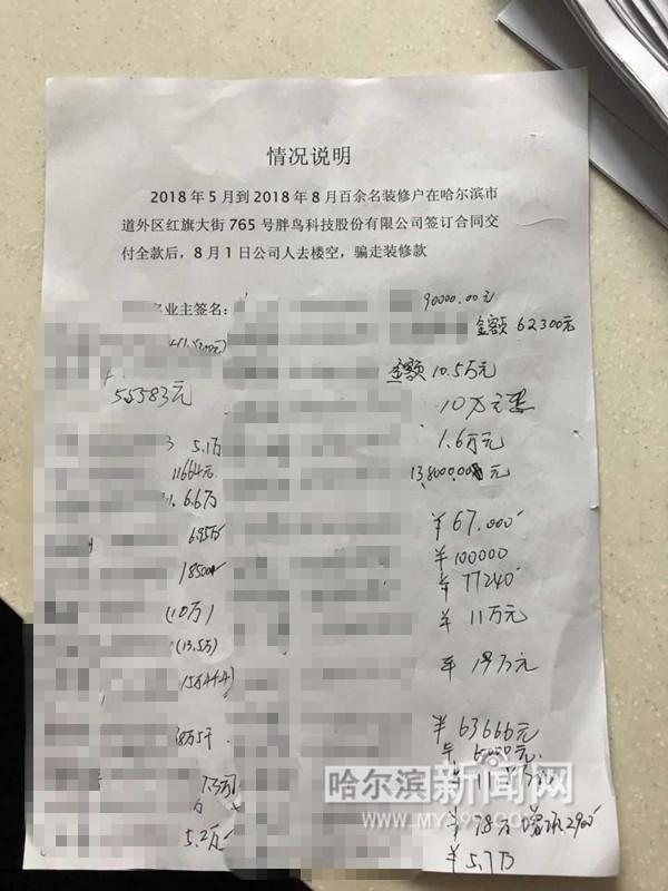 记者查询发现,“胖鸟科技股份有限公司”法人为孟某。记者反复拨打他的电话,一直无人接听。另外,“胖鸟装修”公司在哈西清华大街上的分公司也出现客户堵门、人去楼空的情况。按照维权客户们统计的名单,已有百余名客户遭遇此问题,涉及装修款可能超过700万元。
