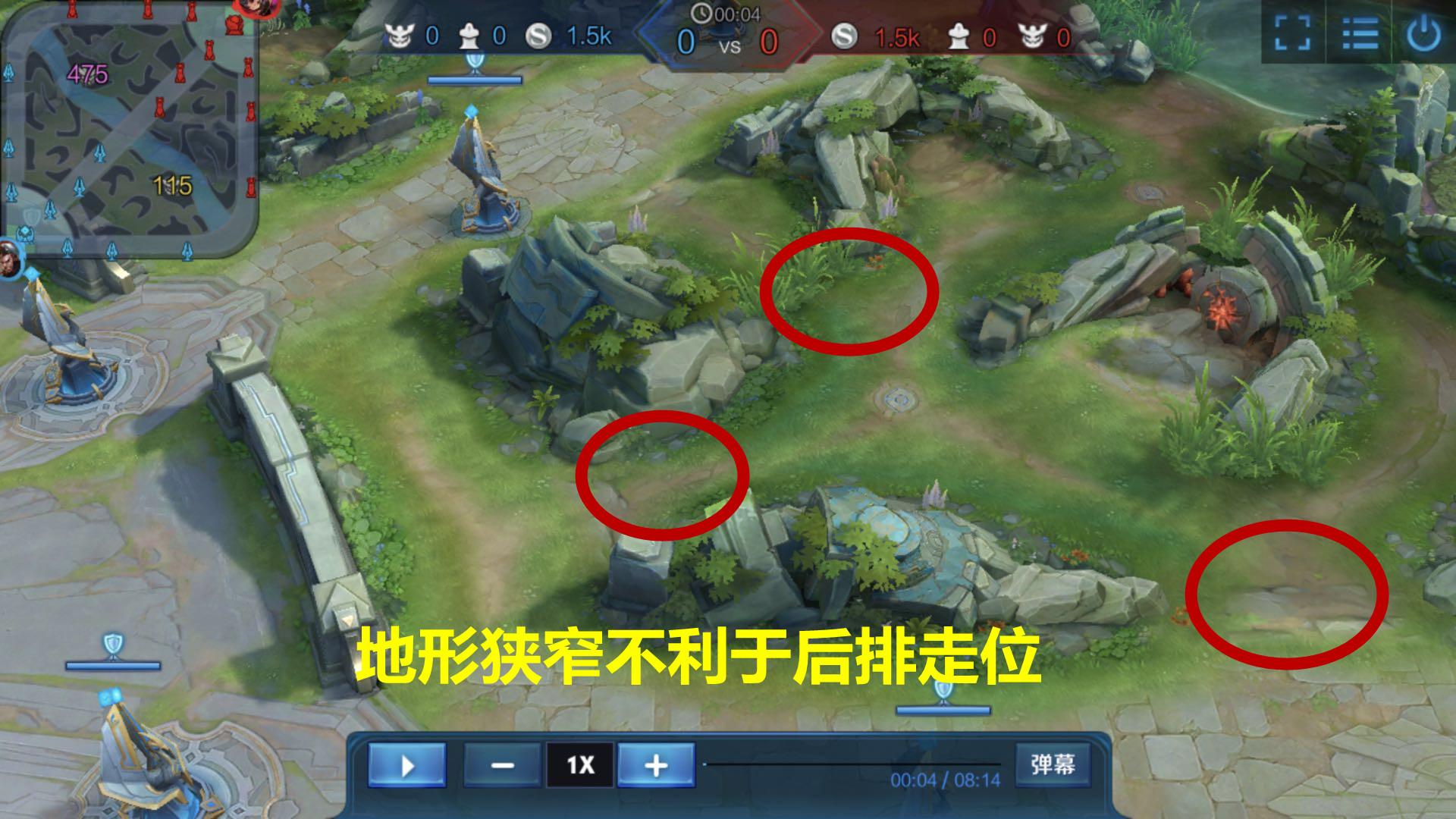 开阔地形:中路及高地塔附近,开阔的地形有利于团战拉扯和C位的走位。