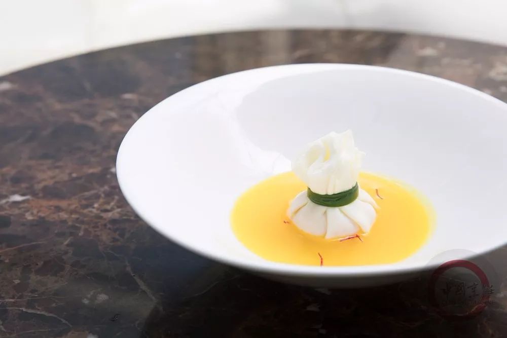 藏红花加清水,入蒸箱蒸至出色,取出,加浓汤熬成红花汁,放入石榴球,装盘即可。