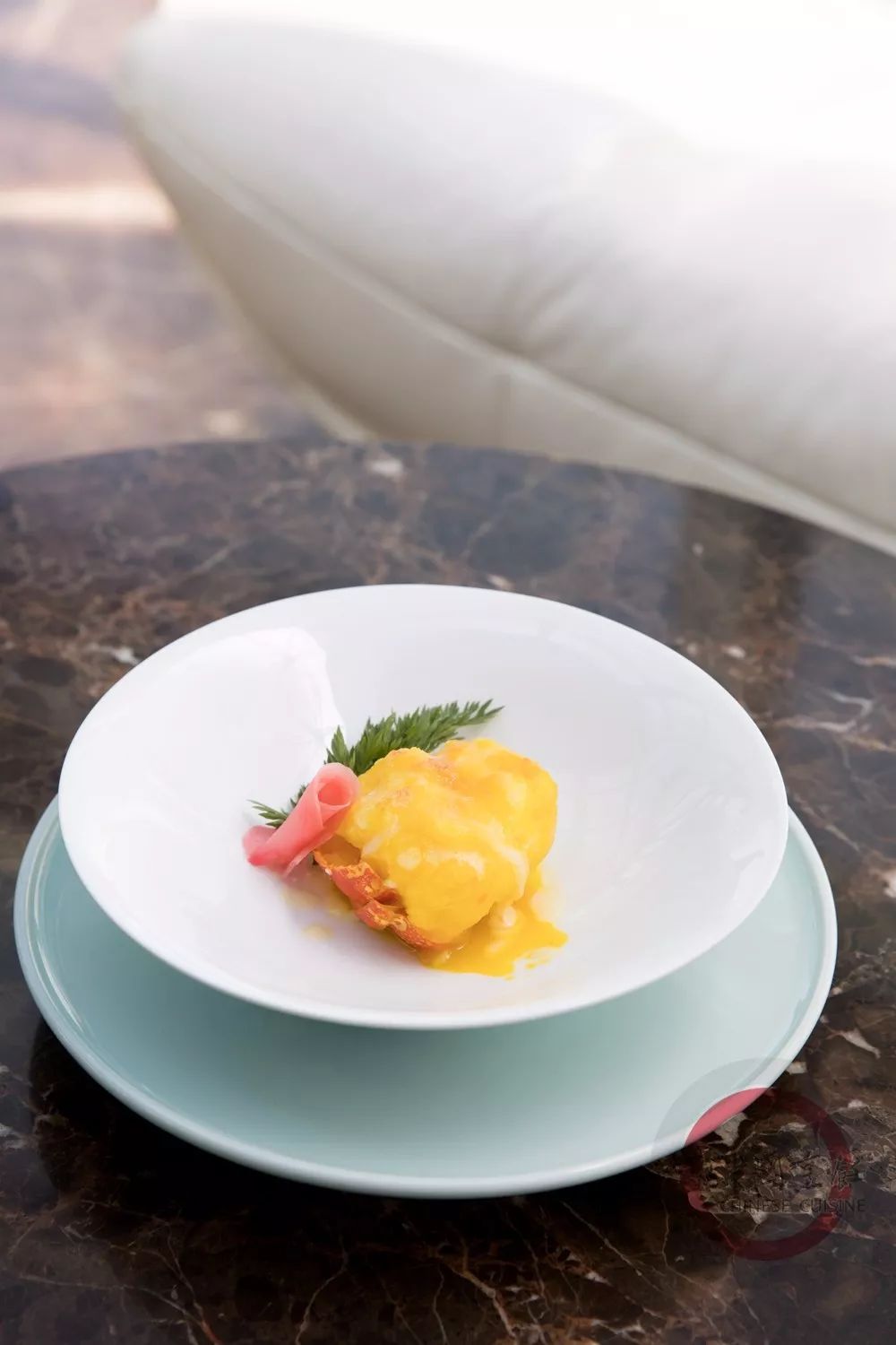 将龙虾熬成虾汤,加米粥熬成红粥,盖在煨好的花胶肚上,点缀日本寿司萝卜、香椿苗、蜜豆即可。