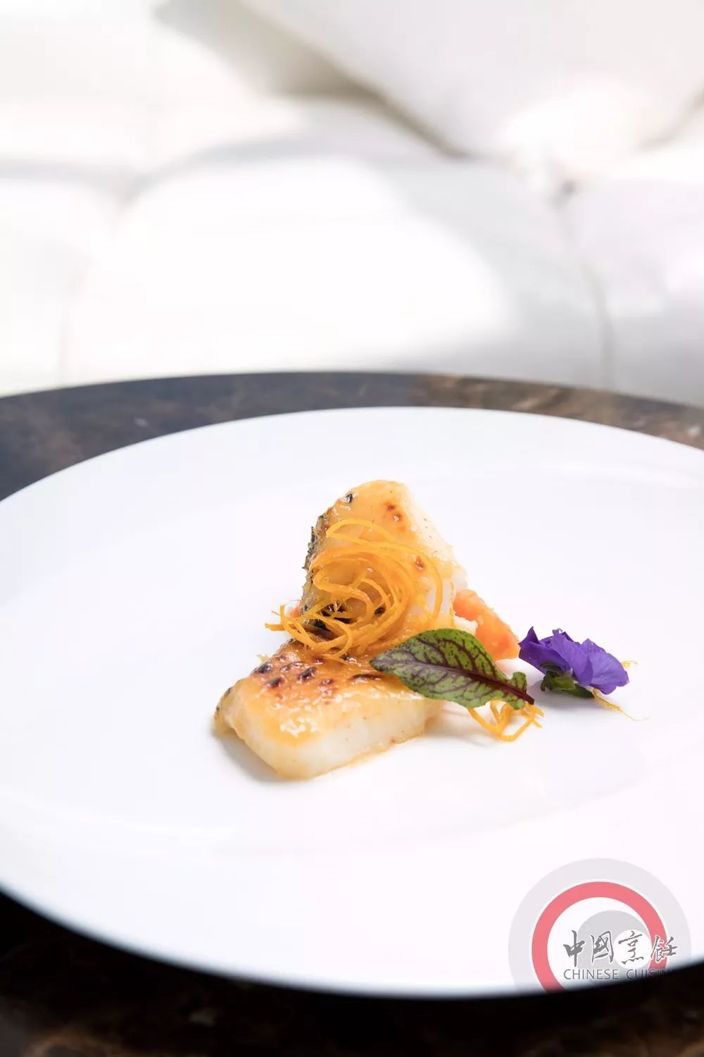 将银鳕鱼用味噌腌制2小时,入烤箱以220℃烤至金黄,取出刷素蟹粉,装盘,点缀红线酸模、可食用花、橘子皮丝即可。