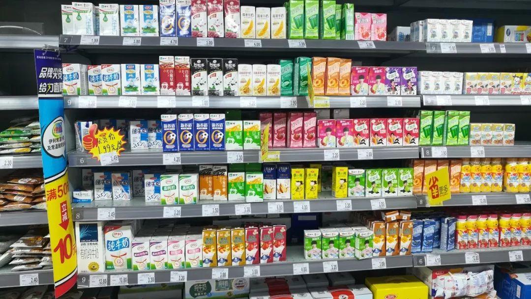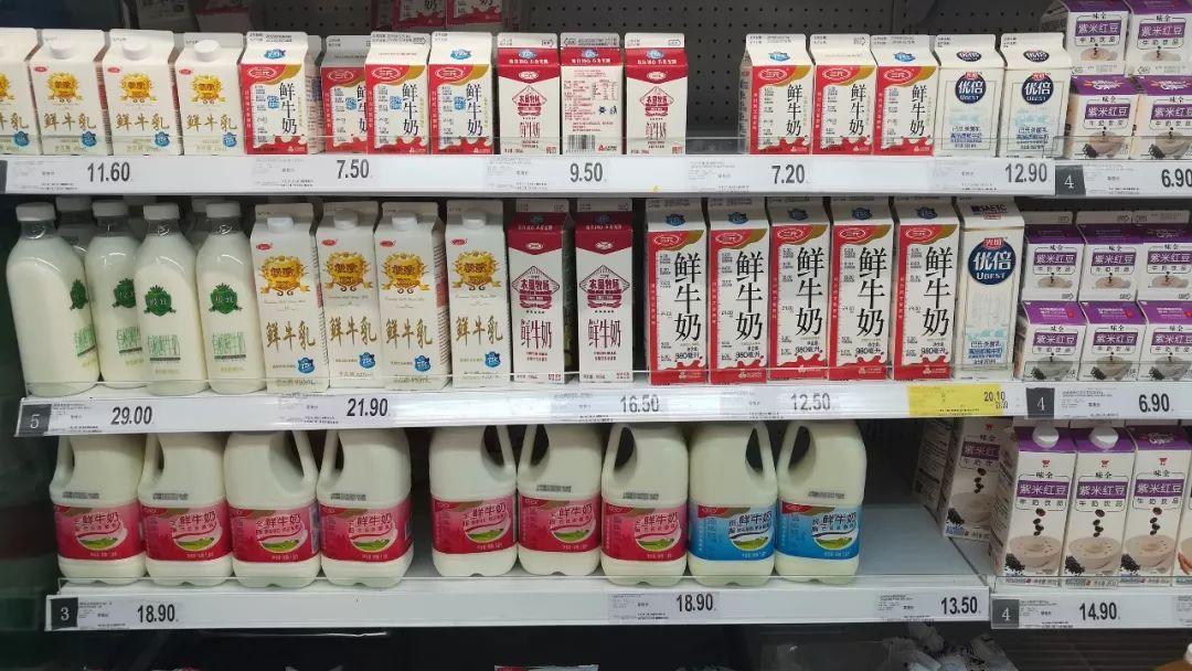 从货架摆放来看,低温奶架摆放着三元极致鲜牛奶、三元鲜牛奶、农垦鲜牛奶、光明优倍鲜牛奶等;国产常温奶货架摆放着伊利纯牛奶、蒙牛纯牛奶,三元纯牛奶、伊利高钙低脂奶、蒙牛谷粒早餐奶、蒙牛新养道等;进口常温奶货架上摆放有德亚纯牛奶、安佳纯牛奶、蜜儿沃克纯牛奶、多美鲜全脂纯牛奶、多美鲜低脂纯牛奶、多美鲜脱脂纯牛奶;另外还有伊利QQ星、蒙牛未来星、三元等儿童成长奶,味可滋香蕉牛奶、蒙牛早餐原麦牛奶、三元巧克力奶等调制乳。
