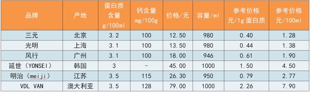 为了更好地比对牛奶的营养价值和性价比,本次采样采用北京家乐福方庄实体店和电商平台京东商城,分别选取基本型1L左右包装的全脂低温灭菌奶,采样品牌包括三元、光明、风行、延世(YONSEI)、明治(meiji)、VDLVAN等6个。以牛奶品牌、产地、蛋白质含量、钙含量、价格、容量六项外包装信息为测量值,计算得出单位参考价格元/1g蛋白质和单位参考价格元/100ml。