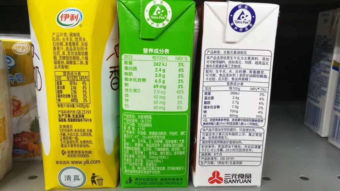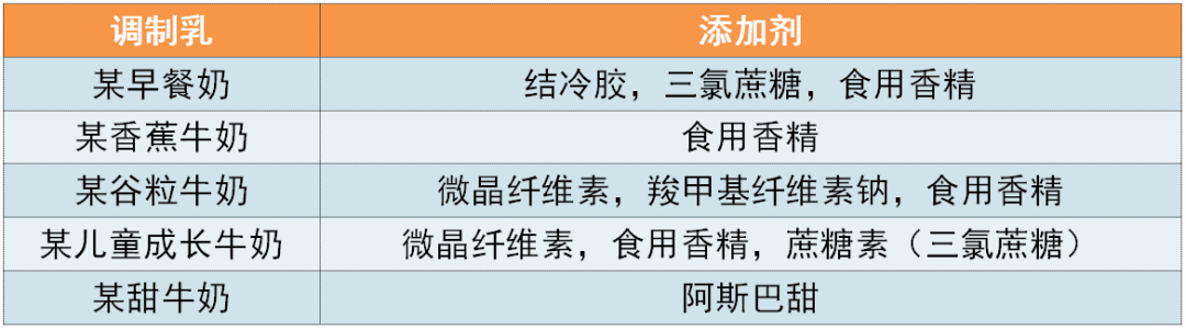 但是,如燕麦牛奶、香蕉牛奶、高钙奶、核桃奶等各种口味的液态牛奶则属于调制乳,其原料五花八门,除牛奶、复原乳外,还有各种添加剂。其中色素、香精、增稠剂(包括微晶纤维素、羧甲基纤维素钠)、甜味剂(包括蔗糖素,安赛蜜和阿斯巴甜)成分,主要用于改善口感和口味,尤其在“儿童成长牛奶”中大量添加。