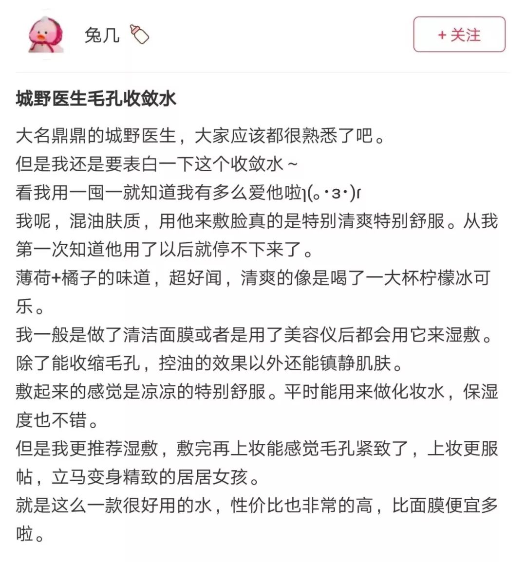 城野医生毛孔收敛水本身兼具 收缩毛孔的功效,而且人家收缩毛孔真的是专家,敷10分钟,毛孔立马隐形不见,鼻头也变得超光滑,特别适合懒癌的小仙女!