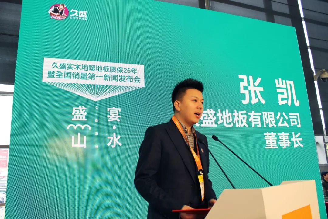 久盛地板董事长张凯上台致辞表示,实木地暖地板品类,是正处于高速发展的新品类,代表着中国社会居住环境消费升级的必然趋势。2017年,久盛地板实施了全新的品牌定位,聚焦实木地暖地板品类,把全国1800家专卖店全部升级为最新的VI形象,并启用了新的LOGO和广告语。2017年,久盛的实木地暖地板品类增长超过200%,成为实木地暖地板全国销售量第一,说明了久盛战略定位的精准。而根据久盛的消费者调研反馈,产品质量和售后服务是他们最担心的两个点。久盛也针对这两个点,提出了质保25年的承诺,开国内实木地暖地板质保期限的先潮。