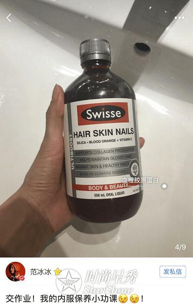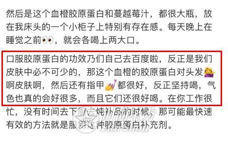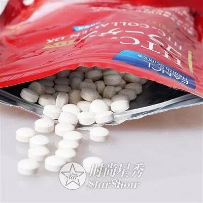 冰冰平时在吃的的保养品也有4、5样,其中还有在内服保养品中最受争议的胶原蛋白饮。