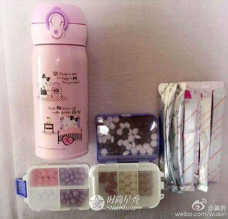 吴昕的更夸张了,随身携带的保养品就10种,囊括了护眼、抗老、胶原蛋白、瘦身、甚至钙片。感觉她每天咽下这些药就已经饱了吧。