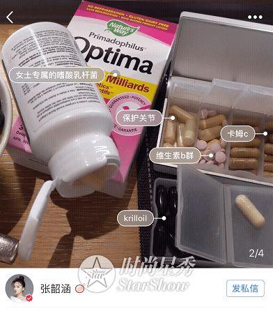 张韶涵平时要吃的保健品就有6、7种,主要focus在女性综合健康调理方面,像我们不常见的卡姆C是一种,从卡姆果实中提取的维C,是维C中最优质的品种。吃完抵抗力杠杠的。