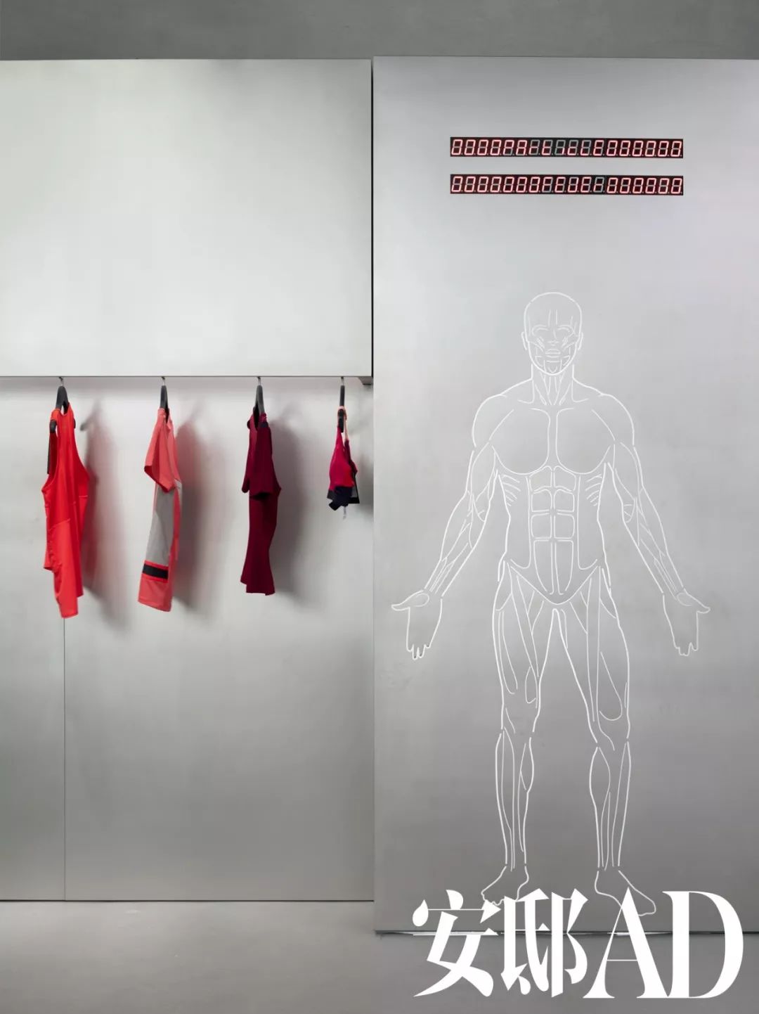 因为喜欢纪录片Particle Fever,联合创始人九斤决定用“粒子狂热”这个名字来描述她与伙伴创立的独立运动品牌。像一个与世隔绝的特殊维度,或充满隐秘细节的太空舱,九斤和设计工作室BENWU Studio希望这个落脚于北京的第一家店铺,能够成为粒子狂热“实验性”气质的真实延伸。因此,入口处的暗调光影让走进的客人“静下来”,墙壁一侧衣架的挂钩被藏起,模拟出在无重力中悬浮的状态,明亮的冷光源与混凝土、不锈钢材质相搭配,不断明确着太空漫步机械般的科技感。