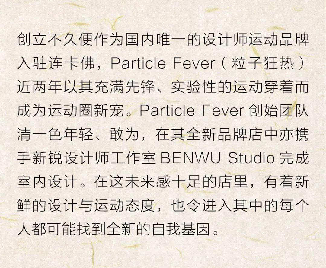 正如店铺所呈现的,九斤认为,包裹在Particle Fever内核外围的也理应有空间、影像、音乐、科技、气味等许多事物。“我一直觉得很多中国消费者是被低估的,”九斤说,“我们其实是在倡导一种多元的、自由的生活态度。对于运动这件事,我不觉得非要练出马甲线,而是当你去尝试一个新事物时,是不是能感到满足。”