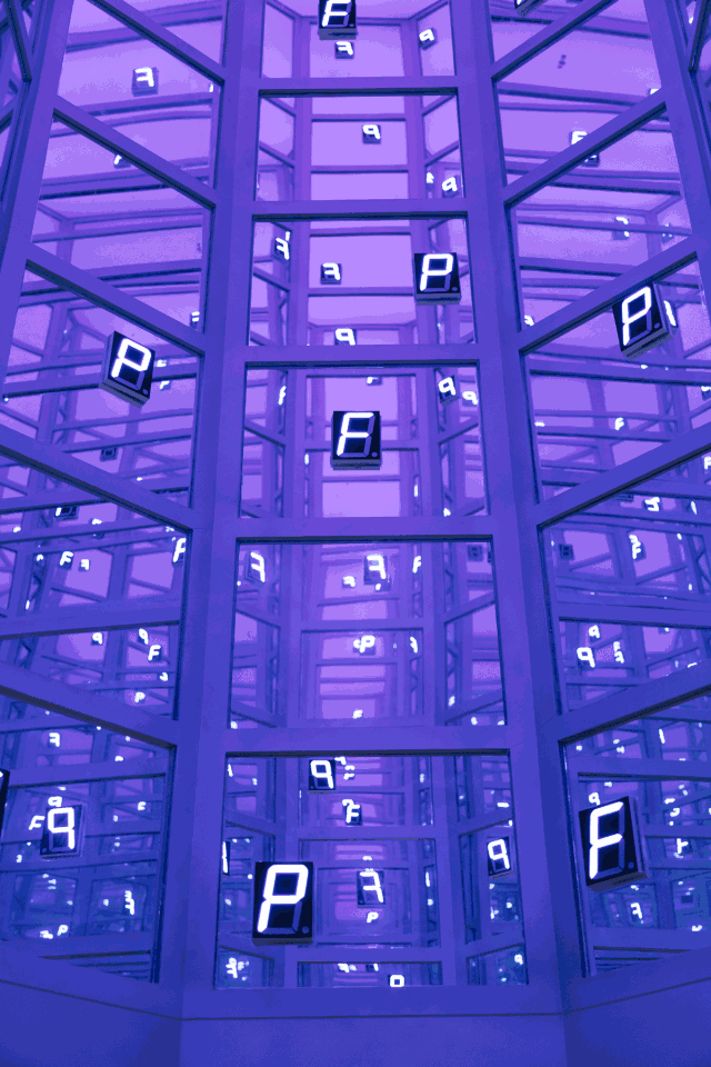 聊到整家店内最喜欢的角落,九斤与BENWU Studio给出了相同的答案:站在更衣区旁仰视,由镜面、跳动的电子字母、循环变幻的颜色与源于粒子结构的八边形装置组成了拍照率最高的天井。它足以吸引门口的客人走近观察,或是在等待试衣时不至于无所事事,这也令九斤想起在店铺开业前曾经做过的一件疯狂的事,“那时我关掉所有灯,打地铺睡在天井下面,感觉自己就在时空里面”。