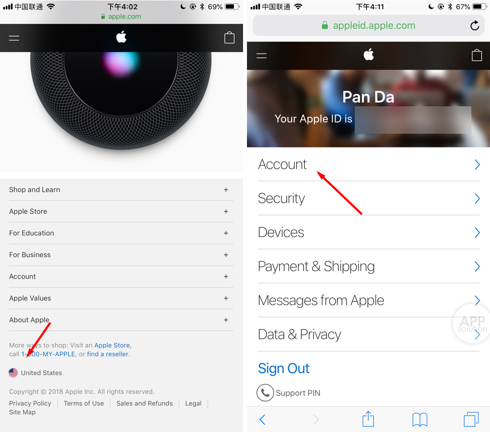 完成之后,会看到整个页面由中文变成英文。重新将页面拉到底部,选择「Account」-「Manage Your Apple ID」。打开新页面后,要注意看左下角的地区标示,如果仍为中国,则需重新点选换到 United States。