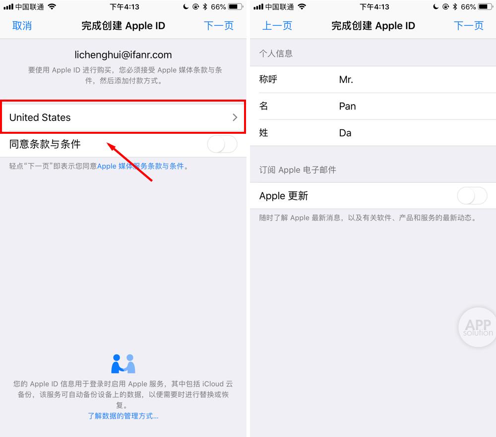 在新页面中,注意查看地区是否为 United States,如果不是需要手动切换至 United States,打开「同意条款与条件」后点击下一步,按照提示填写信息。