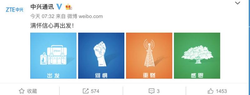 中兴今日正式解禁。中兴在官方微博上了一条消息:“满怀信心再出发!”下面还写了四个字:出发、何惧、重燃、感恩。