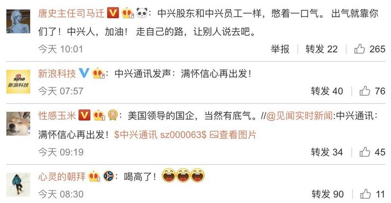 在中兴官微“满怀信心再出发!”的转发评论中,也是一片欣喜之声。