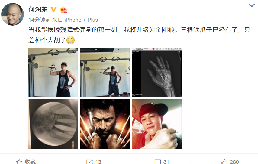 这般惨痛,没想到何润东心情似乎还是不错的,三根钢爪子已经有了,“当我能摆脱残障式健身的那一刻,我将升级为金刚狼。”