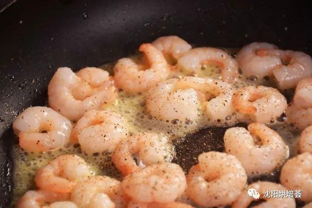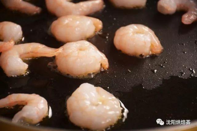 11. 铺上煎香过的虾仁,这时颜色看起来已经丰富多了。