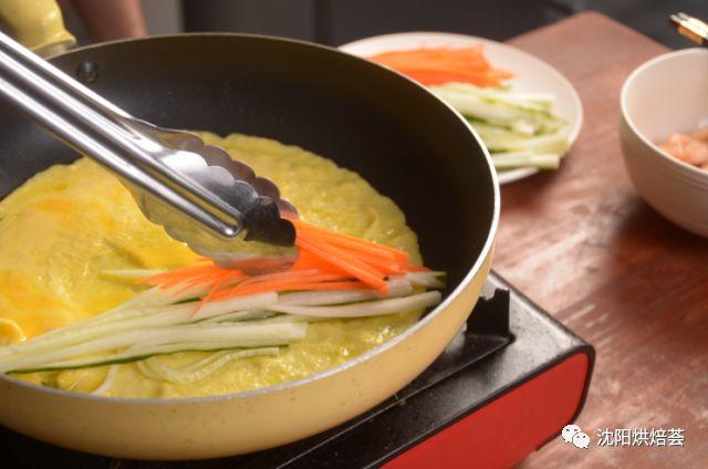 9. 蛋皮煎好后铺上材料。如果怕操作这步的时候蛋皮继续煎会焦的话,可以先关火。