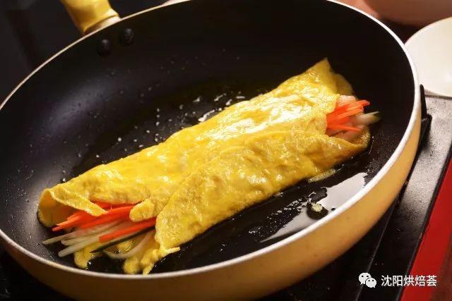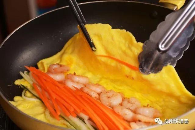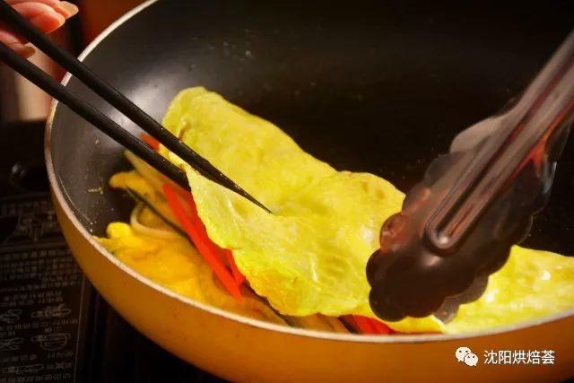 12. 材料只需要铺满蛋皮的一半,因为另一半要盖住材料,再煎一会。
