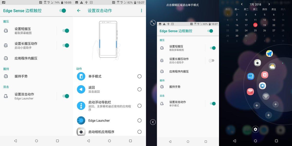 Edge Sense 边框触控 2.0 可以设置双击动作来启动各种自定义程序,例如单手模式、Edge Launcher 边框快捷启动、相机;支持握持手势启动智能转向和智能休眠;长短握压也可以做到截图、启动相机、语音助手之类的操作。