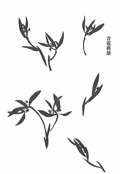 画兰全在于叶,故以叶为先。叶必由起手一笔,有钉头鼠尾螳肚之法。二笔交凤眼,三笔破象眼,四笔、五笔宜间折叶。下包根箨,式若鱼头。成丛多叶,宜俯仰而能生动,交加而不重叠。须知兰叶与蕙异者,细柔与粗劲也。入手之法,略具于此。