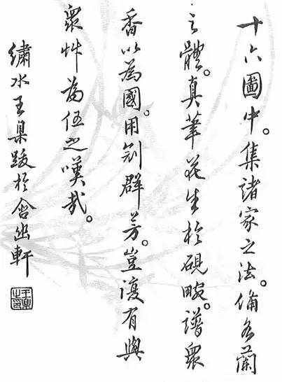 写兰之妙,气韵为先。墨须精品,水必新泉。砚涤宿垢,笔纯忌坚。先分四叶,长短为元。一叶交搭,取媚取妍。各交叶畔,一叶仍添。三中四簇,两叶增全。墨须二色,老嫩盘旋。瓣须墨淡,焦墨萼鲜。手如掣电,忌用迟延。全凭写势,正背欹偏。欲其合宜,分布自然。含三开五,总归一焉。迎风映日,花萼娟娟。凝霜傲雪,叶半垂眠。枝叶通用,如风翩翩。葩萼飘逸,似蜨飞迁。壳皮装速,碎叶乱攒。石须飞白,一二傍盘,车前等草,地坡可安。或增翠竹,一竿两竿。荆棘旁生,能助其观。师宗松雪,方得正传。