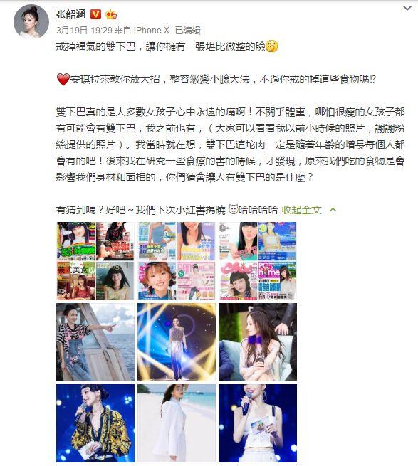 电眼娃娃张韶涵在综艺节目中收到了全民高度关注,除了歌喉依旧,她的容貌也比刚出道更加精致啦,最近,她本人也大方晒出了“整容”秘诀——去除双下巴!