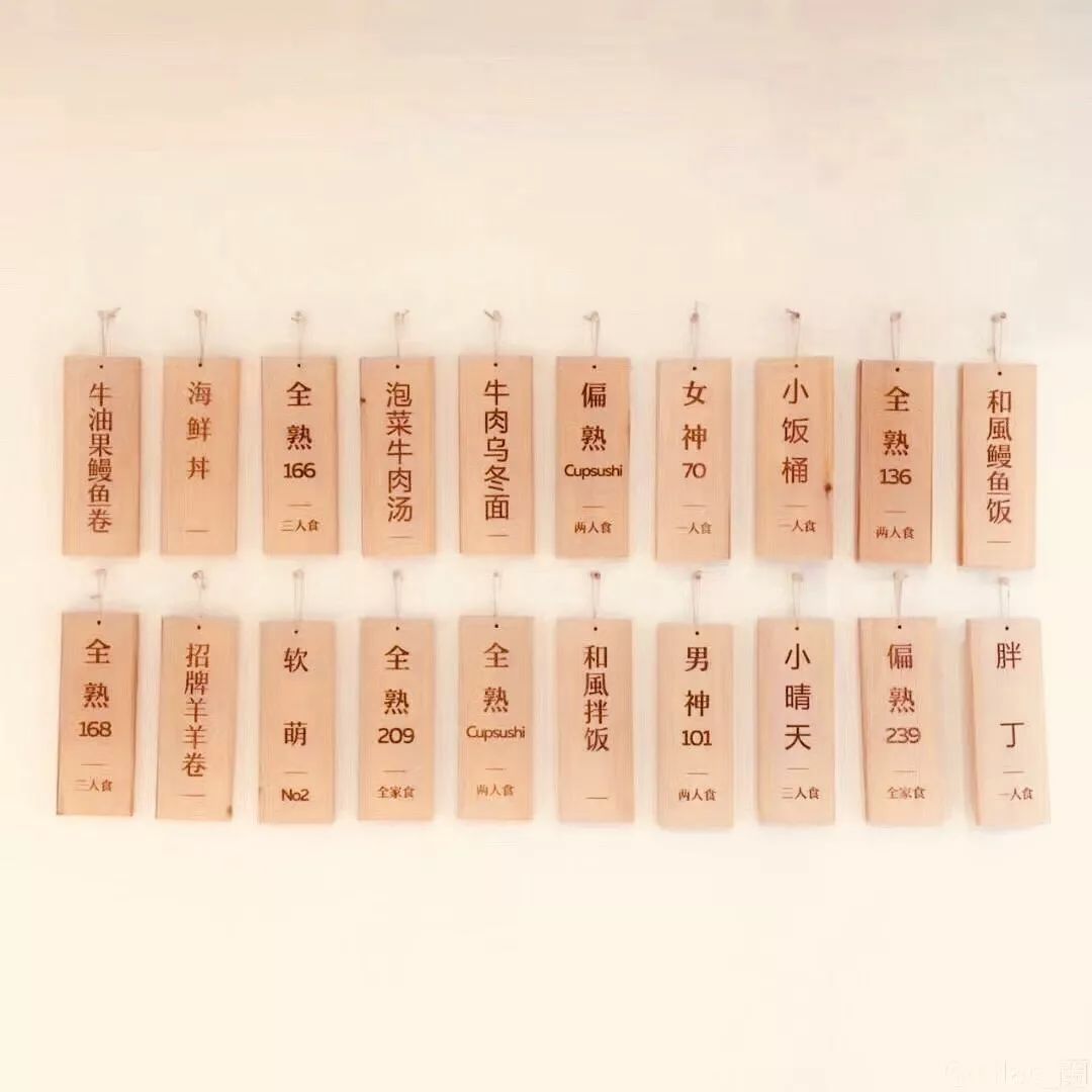 原木色的布置透着暖暖述说的温度,细节处也看得出经营者的用心。菜单用原木雕刻挂在墙上,最过目不忘的是墙上那一句:“做一个有梦想的寿司。”
